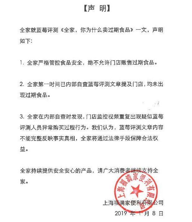 對此,全家發(fā)表聲明稱,首先全家嚴(yán)格管控食品安全,絕不允許門店販?zhǔn)圻^期食品;其次藍(lán)莓評測內(nèi)容不能完整反映事實真相,全家將通過法律手段保障合法權(quán)益。
