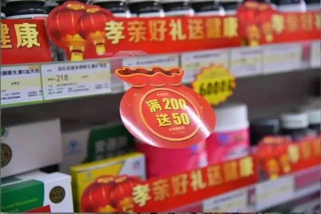 紅色的pop廣告牌本就喜慶搶眼,再加上福袋樣式的廣告卡上“買200送50”的活動字樣,與“孝親好禮送祝福”的活動標語潛移默化的影響著顧客,激發他們將藥店貨架上的藥品帶回家的欲望。
