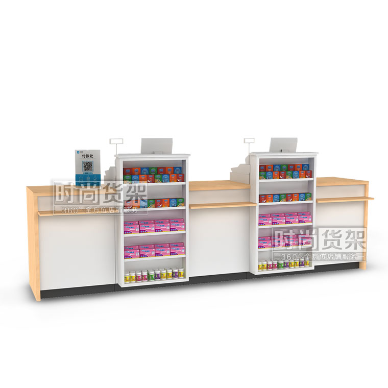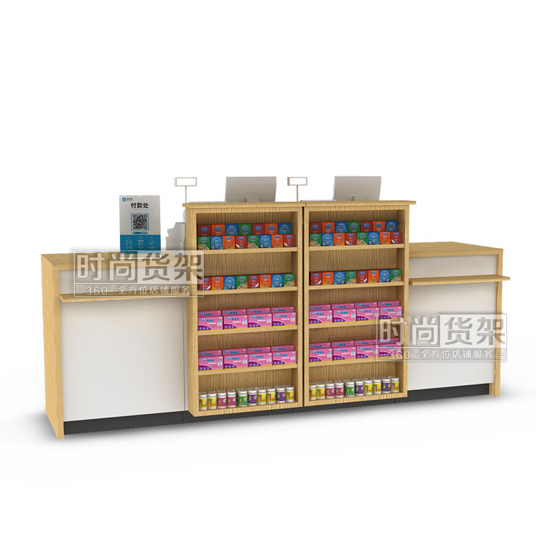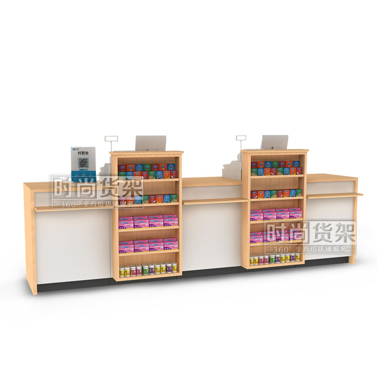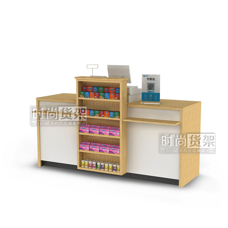 這是深圳貨架廠——時尚貨架最新推出的一款適用于母嬰店收銀區的母嬰店木紋收銀臺,想了解其他貨架請咨詢客服。