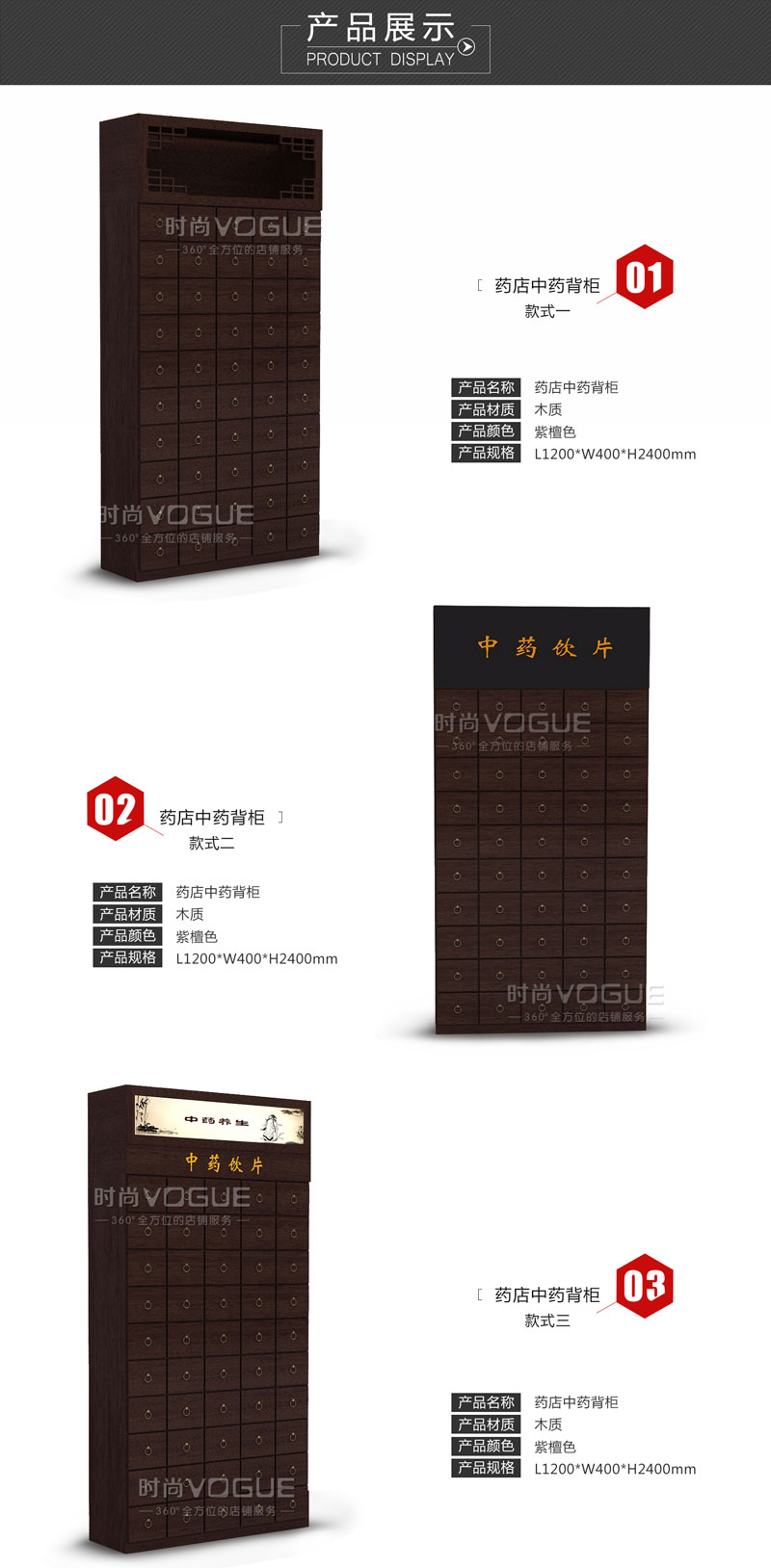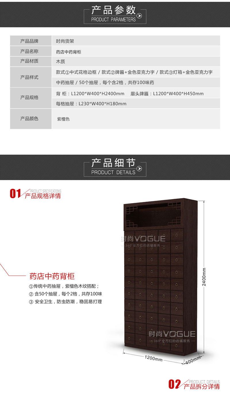 - 產(chǎn)品描述:本款木紋中藥柜是時(shí)尚貨架專為藥店打造的全木質(zhì)中藥背柜,采用紫檀木紋,外形美觀,做工優(yōu)良,適合長(zhǎng)期使用。