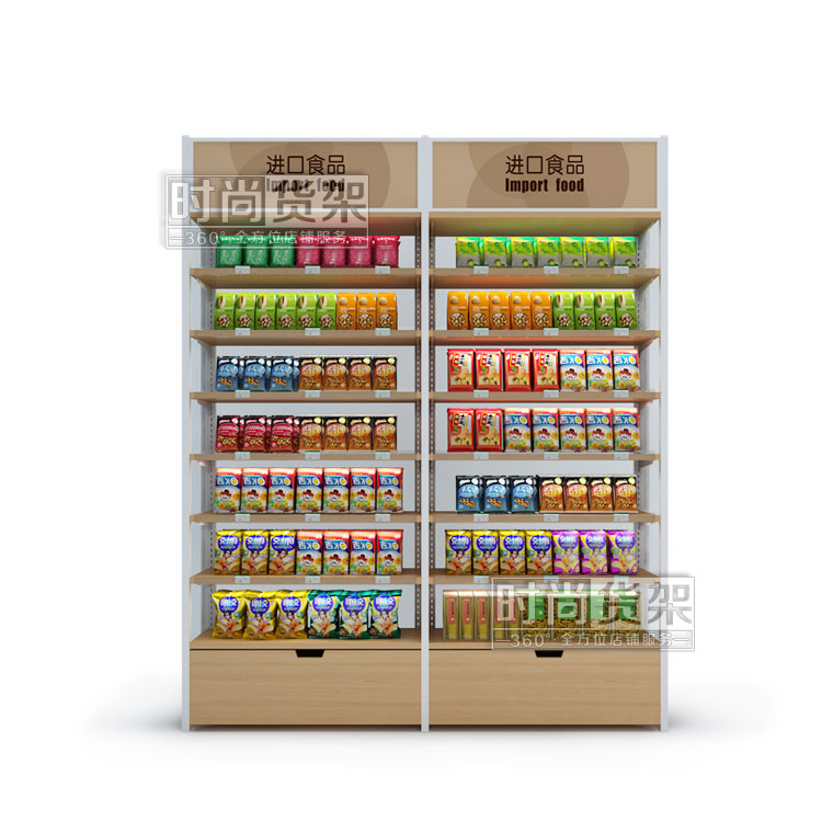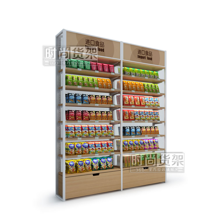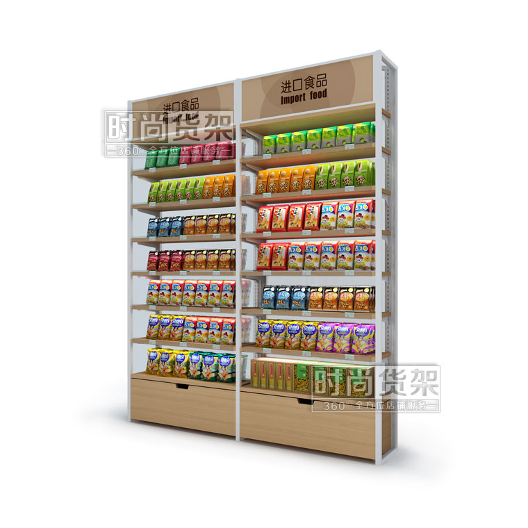 【特點】透光性強的輕便陽光背板、環保高檔的木質層板,打造出了這款精制時尚的高檔食品貨架。頂部廣告牌的設計很好地對商品進行分類指示,引導顧客更好地購物,底部的地柜設計也十分巧妙,增加了貨架整體的儲物功能,將便利店空間更合理地利用了起來。