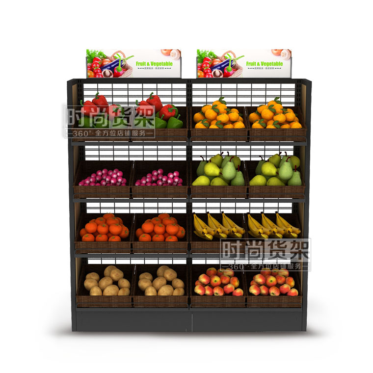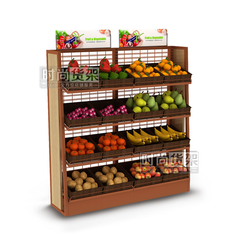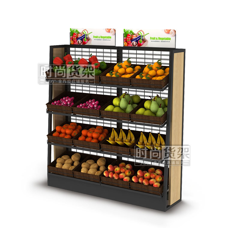 【描述】采用優質鋼立柱,網狀背板,可有效節省成本 ;層板可調節設計,可根據果蔬的重量和數量來調節貨架的層數;層板上可以搭配棕色的藤框,凸顯自然美觀,可有效區分果蔬種類,方便顧客選購。