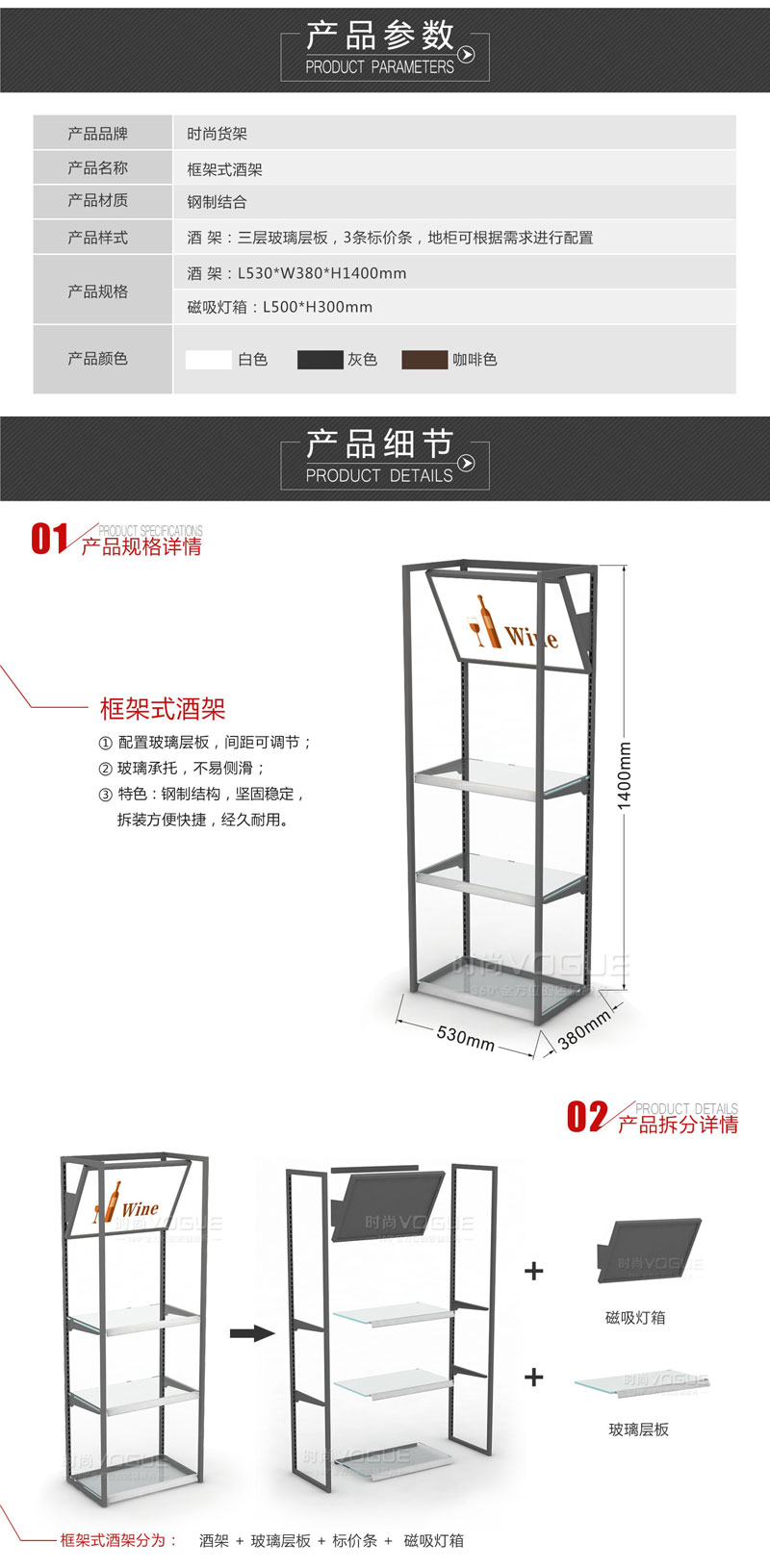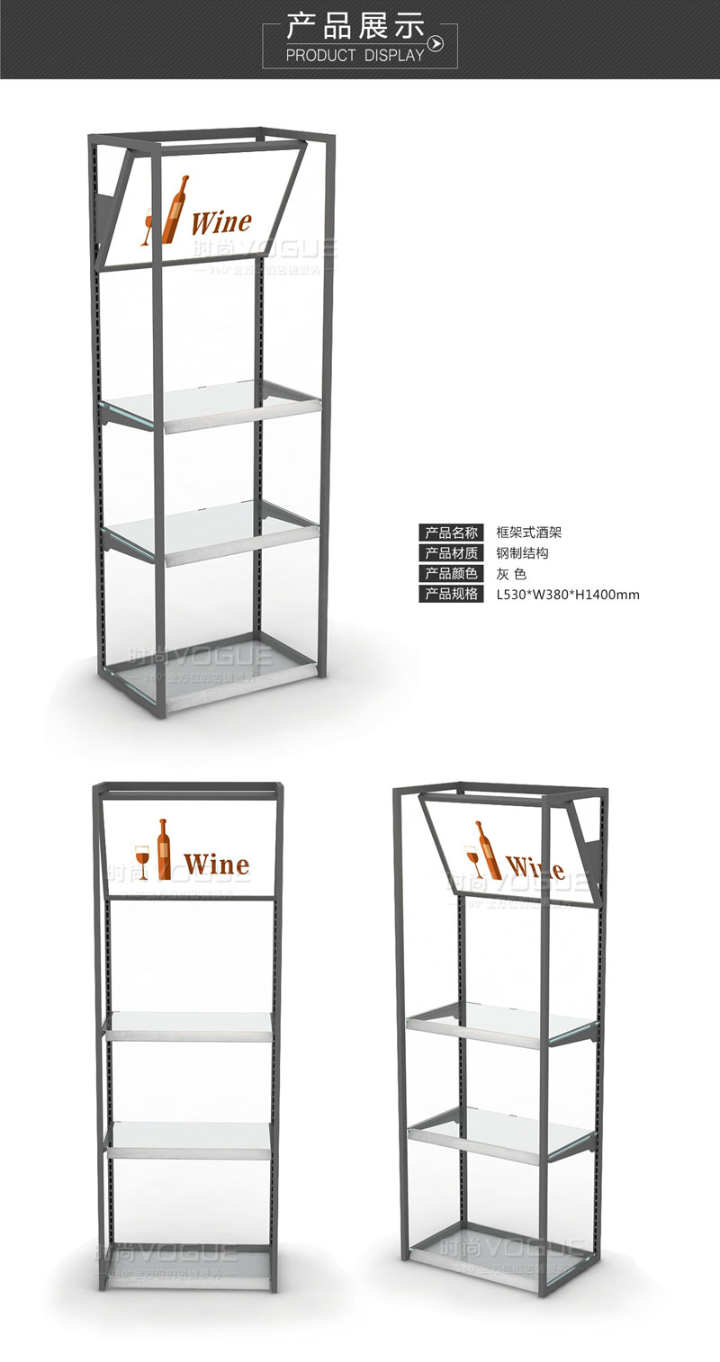 - 產(chǎn)品描述:此款便利店貨架是時(shí)尚貨架專(zhuān)為便利店客戶設(shè)計(jì)的一款框架式白酒展示架。