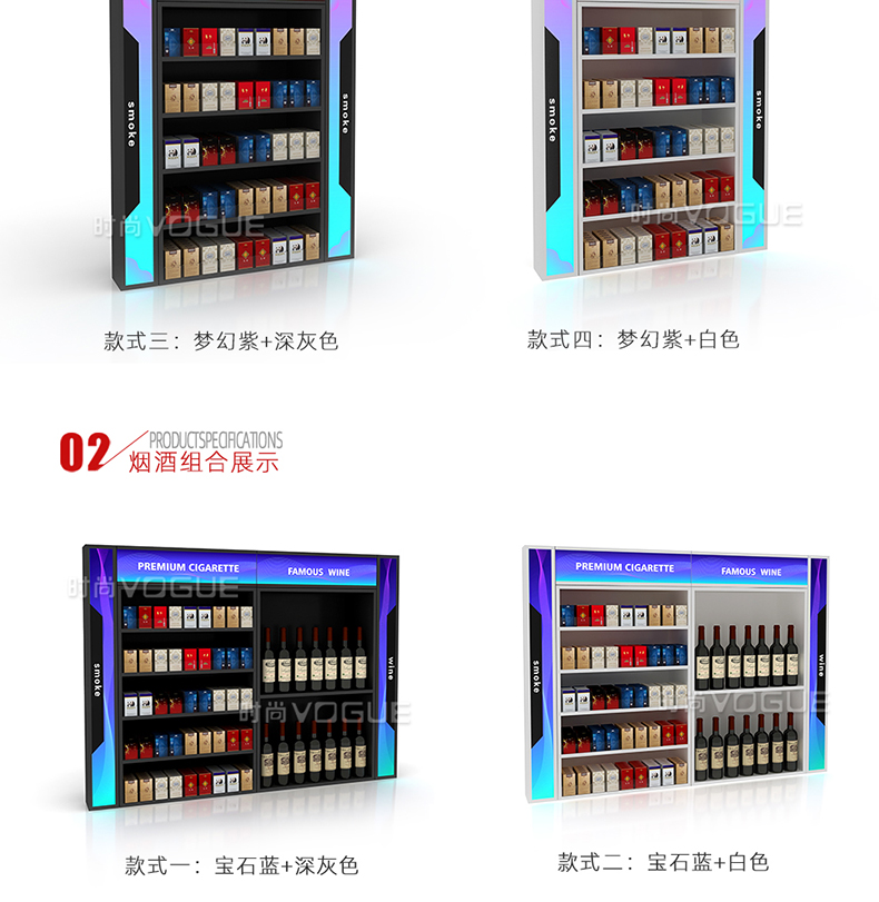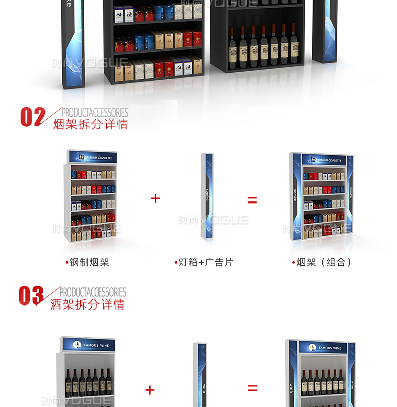收銀臺紅酒架組合而成。便利店煙酒架立柱采用優質鋼材,具有很好的承重能力。頂部配有磁吸燈箱廣告牌,即可宣傳品牌,又可以指引顧客,讓整個收銀區的工作效率顯著提高。此款收銀區煙酒架是框架式結構,可以直接放置在收銀背柜上,穩定性和安全性很好。