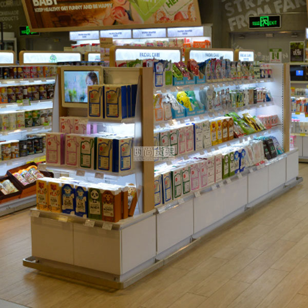 【產(chǎn)品名稱】鋼木結(jié)合雙面貨架/精品超市帶地柜中島貨架/精品超市中島貨架